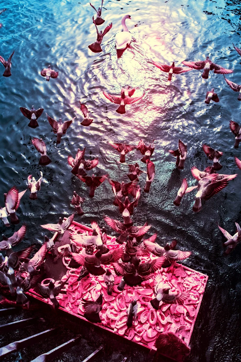 Das Werk „Zauberwald“ entstand im Rahmen einer weiteren Zusammenarbeit mit der Mobimo AG. Die großformatige Fotografie, aufgenommen mit Infrarotfilm, wurde in den skulpturalen Treppenaufgang eines Wohnquartiers in Zürich integriert.
